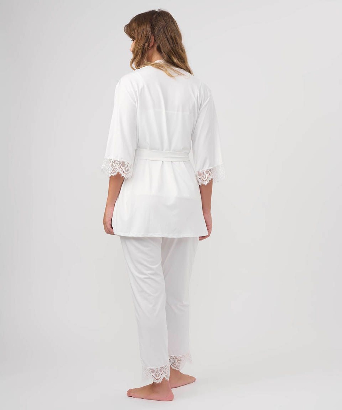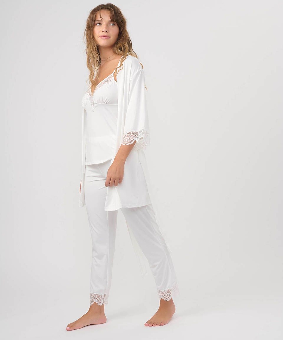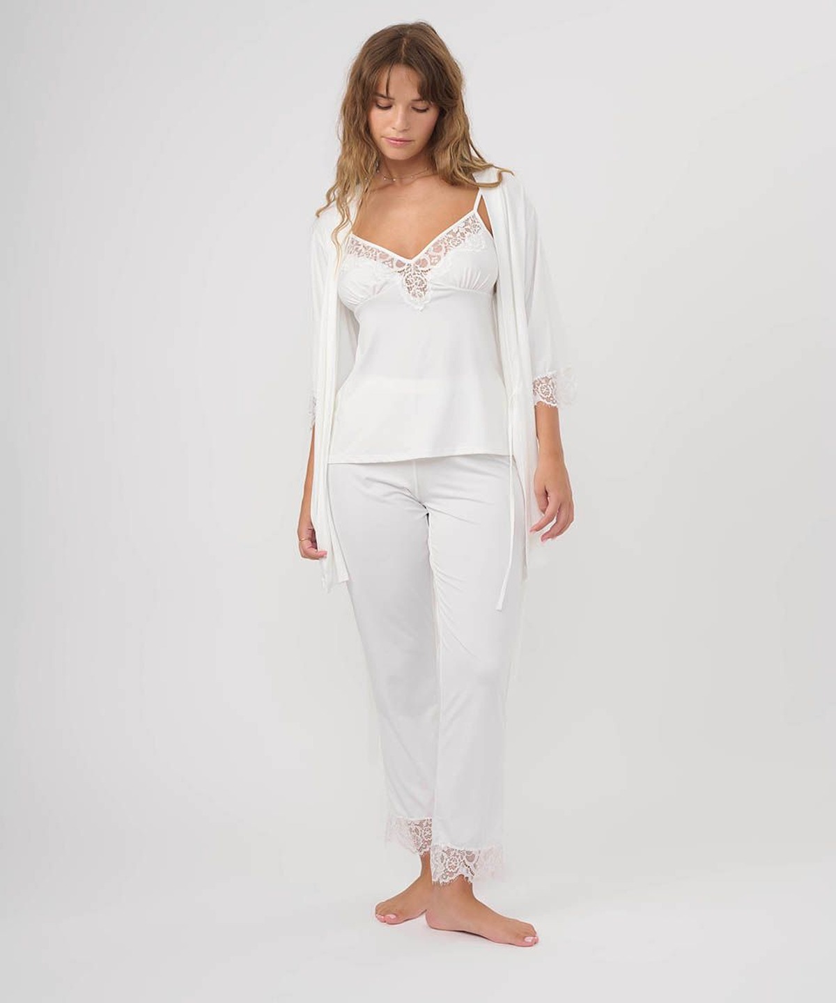 • כולל חלוק בגזרה משוחררת עם שרוול 3/4, גופייה דקה עם כתפיות דקות ומפתח צוואר וי, ומכנסיים ארוכים
